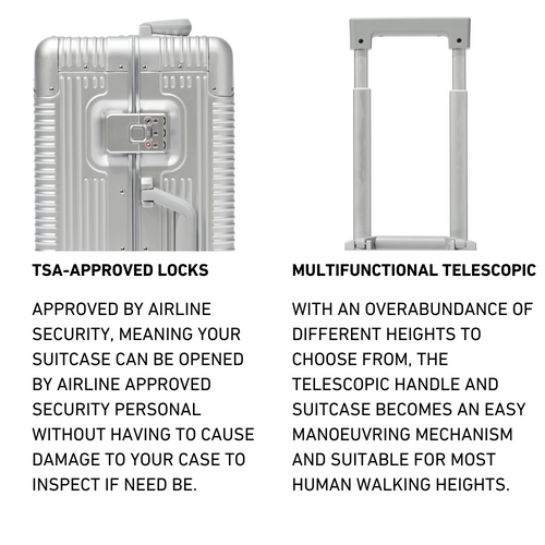 Designed and patented in New York, the Apollo S Passenger "Advanced" introduces one of the most advanced and premium anodized aluminum suitcases ever created. This exclusive piece includes further advancements from the previous Apollo "S," such as a larger wheel diameter and mold for enhanced support and maneuverability, reinforced TSA combination locks, and a heightened telescopic handle with more adjustment options. Additionally, it features thickened reinforced German-grade aluminum and comes with a high-end cotton canvas dust bag to protect it from the elements when in storage.