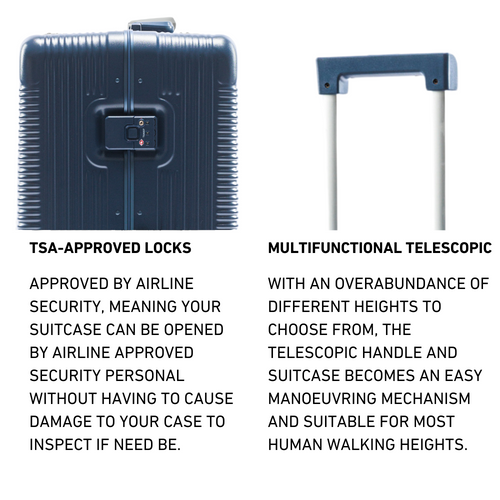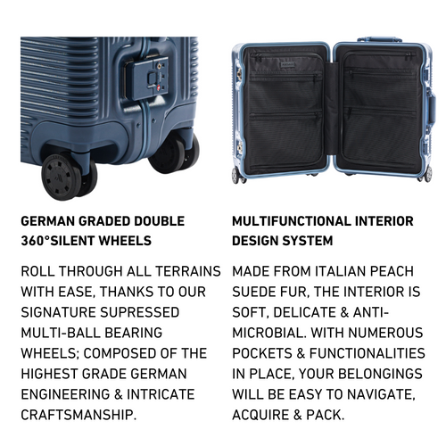 Crafted with precision and care, our Signature Cases set a new standard in global travel. Featuring a durable German polycarbonate aero-grade shell, aluminum framing, reinforced protective corner plates, a multi-level adjustable telescoping handle with enhanced security, and a much larger, more durable wheel housing that composes 360-degree German Run-Silent shock-absorbing wheels, they deliver an exceptional travel experience. Inside, a thoughtfully designed interior with clever organizational components makes packing and unpacking effortless.